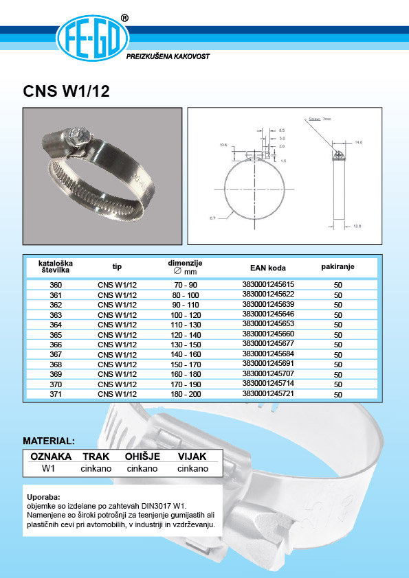Cevna objemka (šelne, prirobnice, spojke, stege, priteznice) CNS W1/12 je izdelana po zahtevah DIN3017 W1. Objemka je namenjena široki potrošnji za tesnjenje gumijastih ali plastičnih cevi pri avtomobilih, v industriji in vzdrževanju.