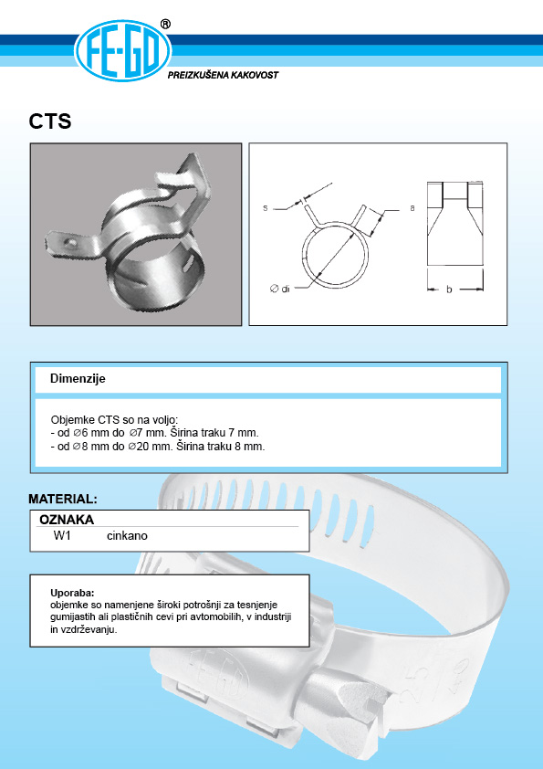 Cevna objemka (šelne, prirobnice, spojke, stege, priteznice) CTS je namenjena široki potrošnji za tesnjenje gumijastih ali plastičnih cevi pri avtomobilih, v industriji in vzdrževanju.