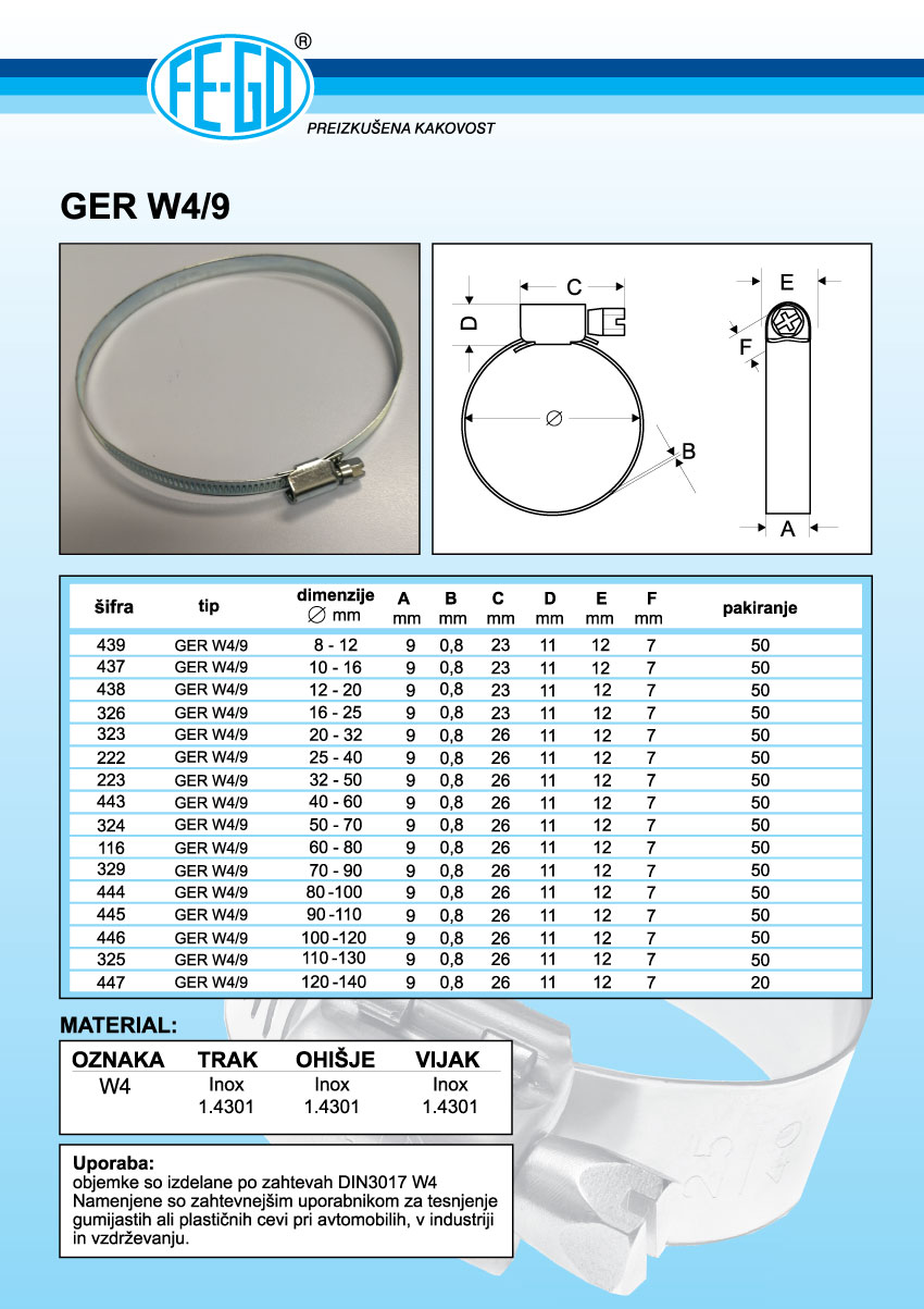 Objemke GER W4/9 so izdelane po zahtevah DIN 3017 W4. Cevne objemke tega tipa priporočamo za zahtevnejše uporabnike za tesnjenje gumijastih ali plastičnih cevi pri avtomobilih, v industriji ali vzdrževanju.