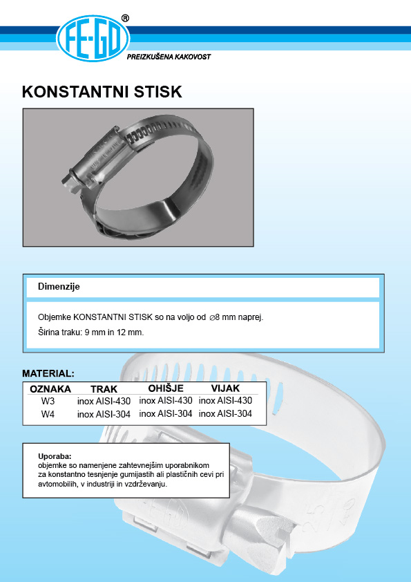 Objemke Kontantni stisk so izdelane po zahtevah DIN 3017 W2. Cevne objemke tega tipa priporočamo za zahtevnejše uporabnike za tesnjenje gumijastih ali plastičnih cevi pri avtomobilih, v industriji ali vzdrževanju.